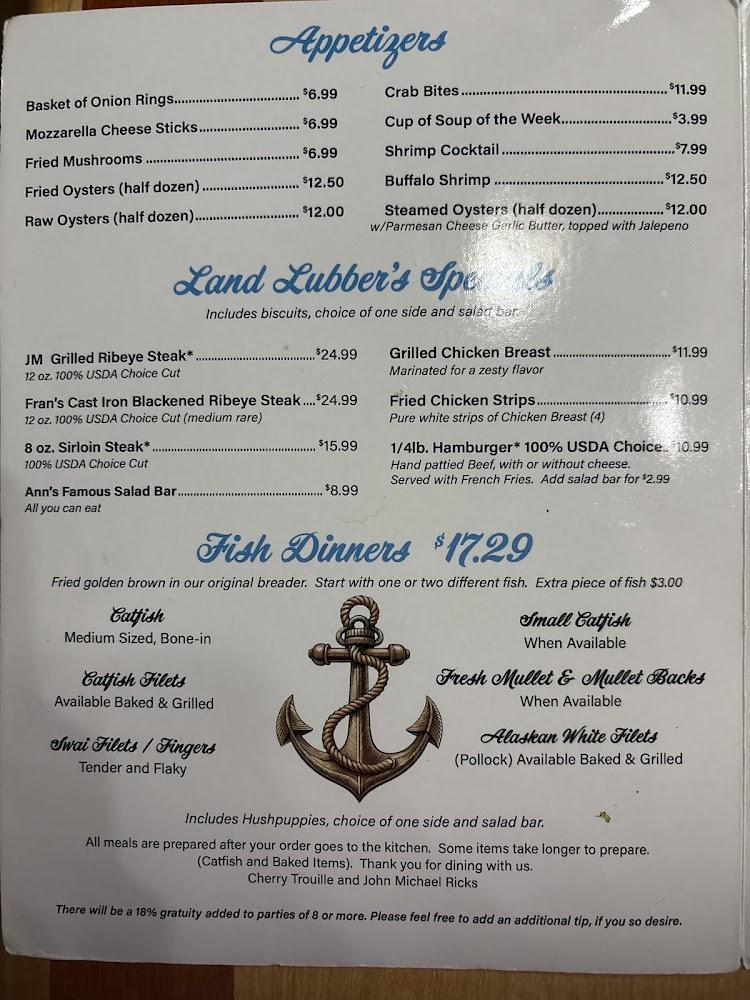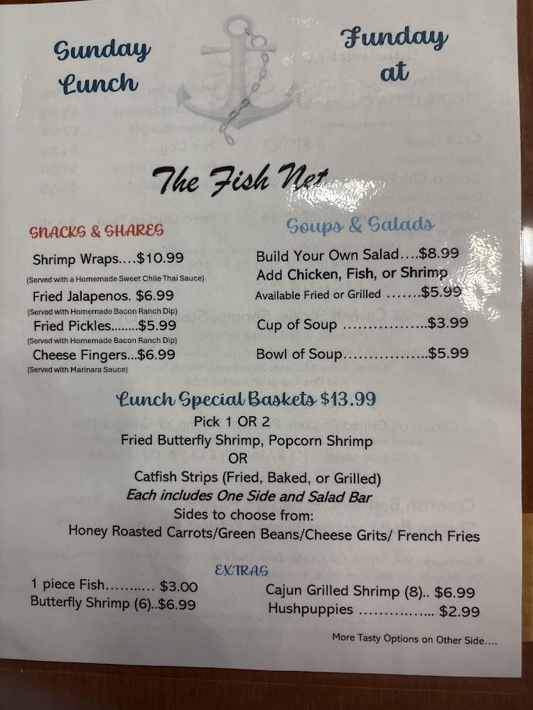 The Fish Net Restaurant's menu offers a diverse seafood selection, featuring staples like fresh catfish and shrimp platters. Aside from seafood, grilled meats, and hearty sides round out the offerings. Expect to find fried options, salads, and house specialties like grits and hushpuppies.